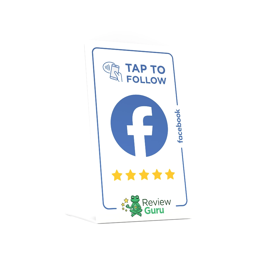 Enhance your social media presence with Review Guru’s Smart Facebook NFC Stand. This sleek stand allows customers to connect with your Facebook profile effortlessly, boosting your online engagement and expanding your audience. Designed for visibility, it can be prominently displayed in your business premises, ensuring it’s always accessible for convenient use.